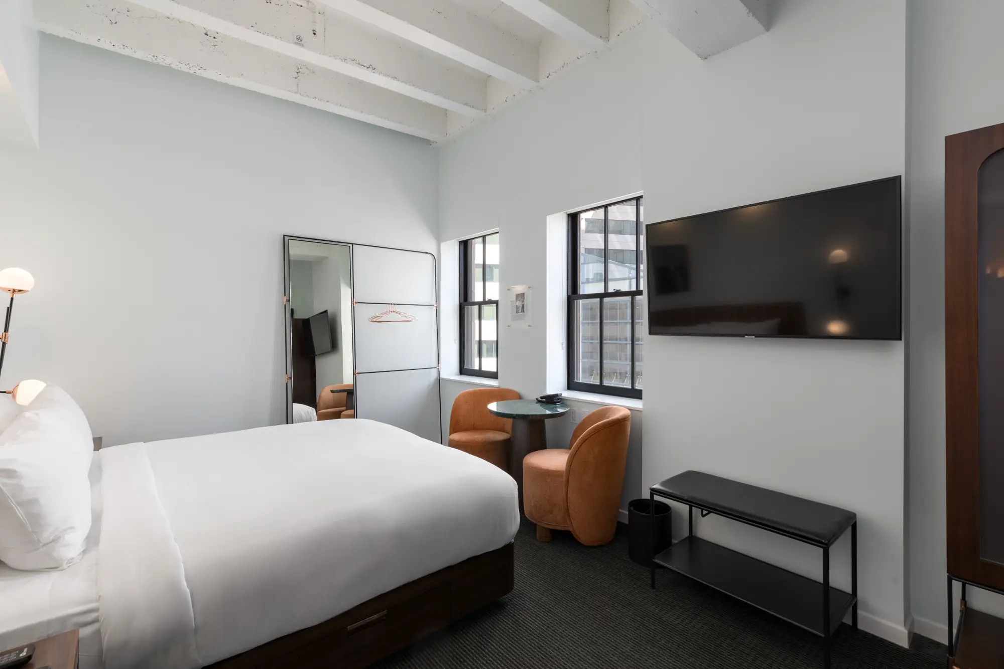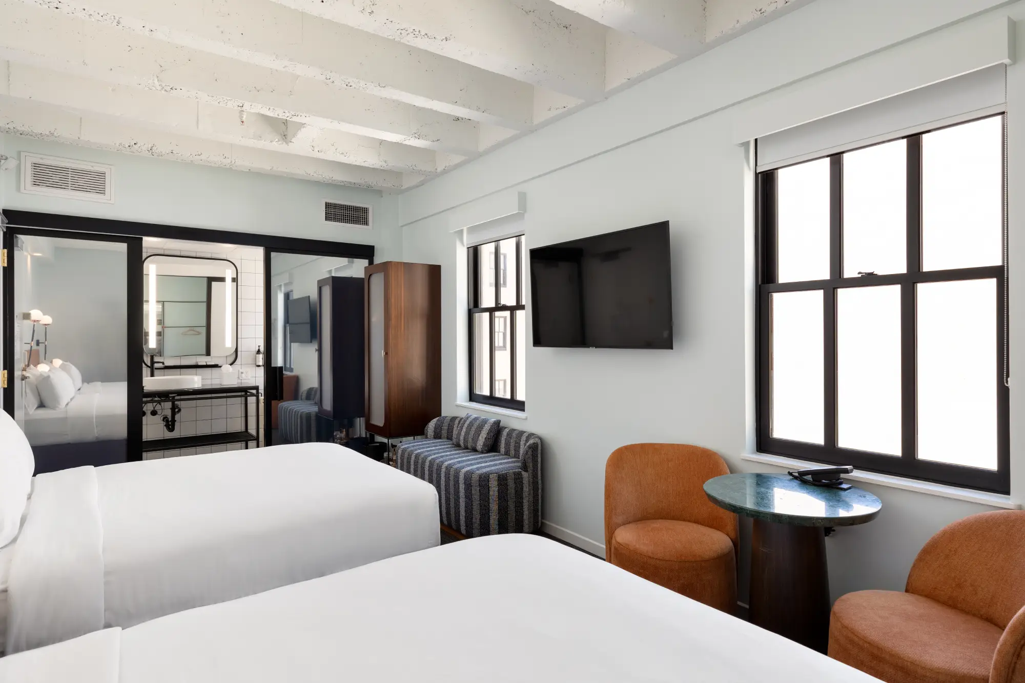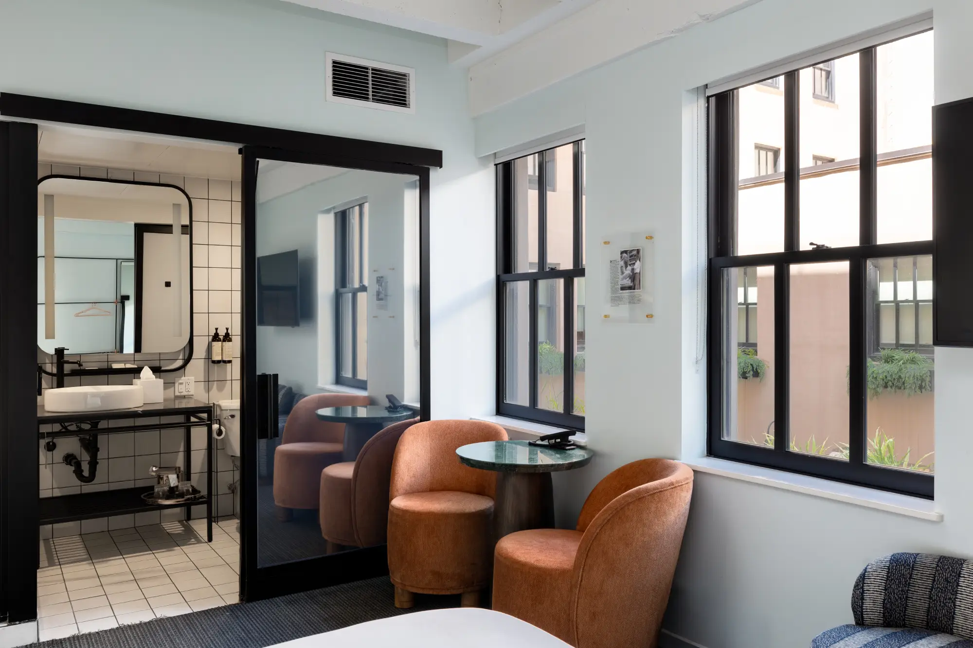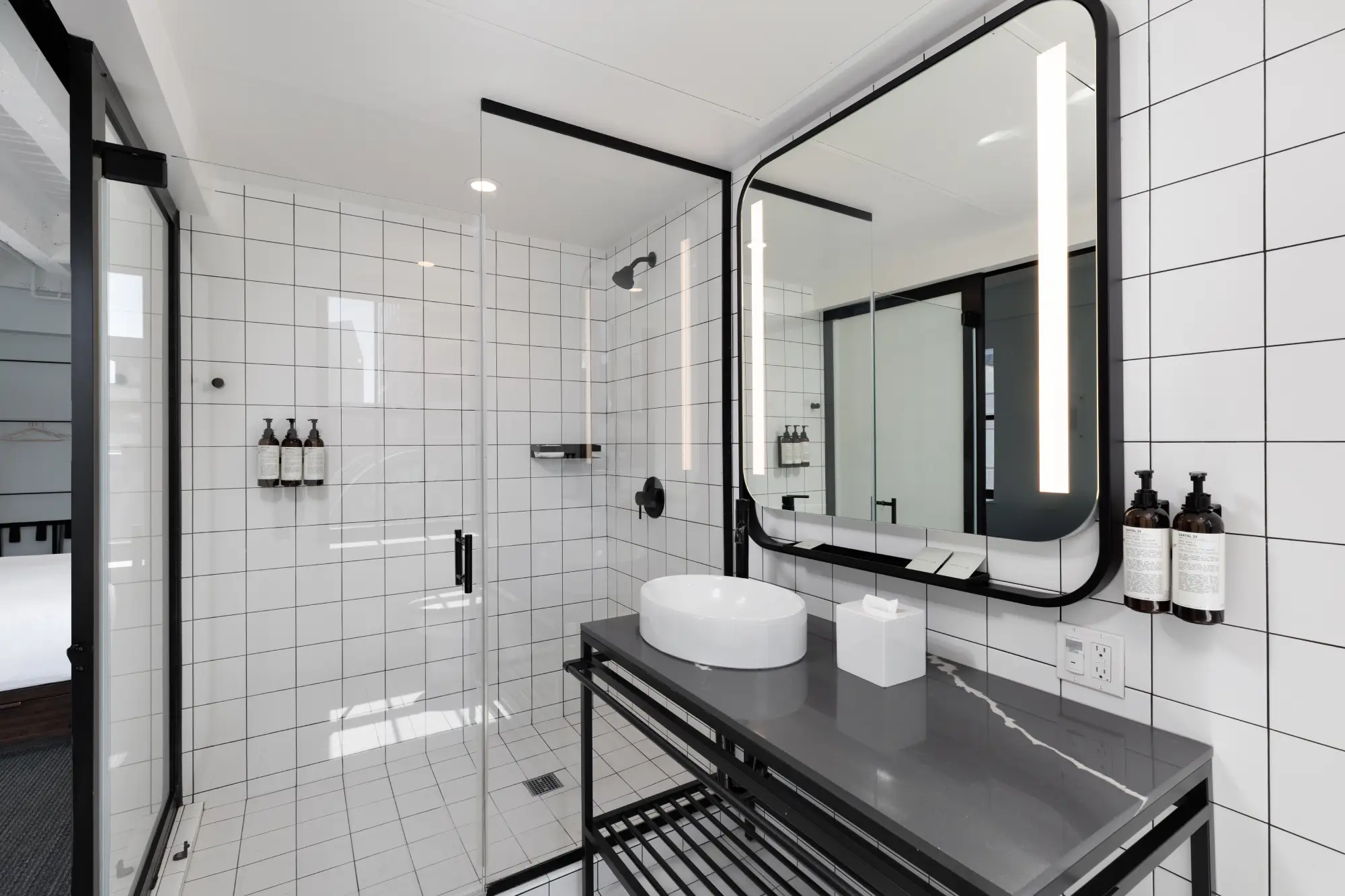 Modern studio with sitting area, sleeper sofa and curated local art. Enjoy Le Labo bath amenities, plush bathrobes & slippers, and walk-in showers or tubs with handheld feature.