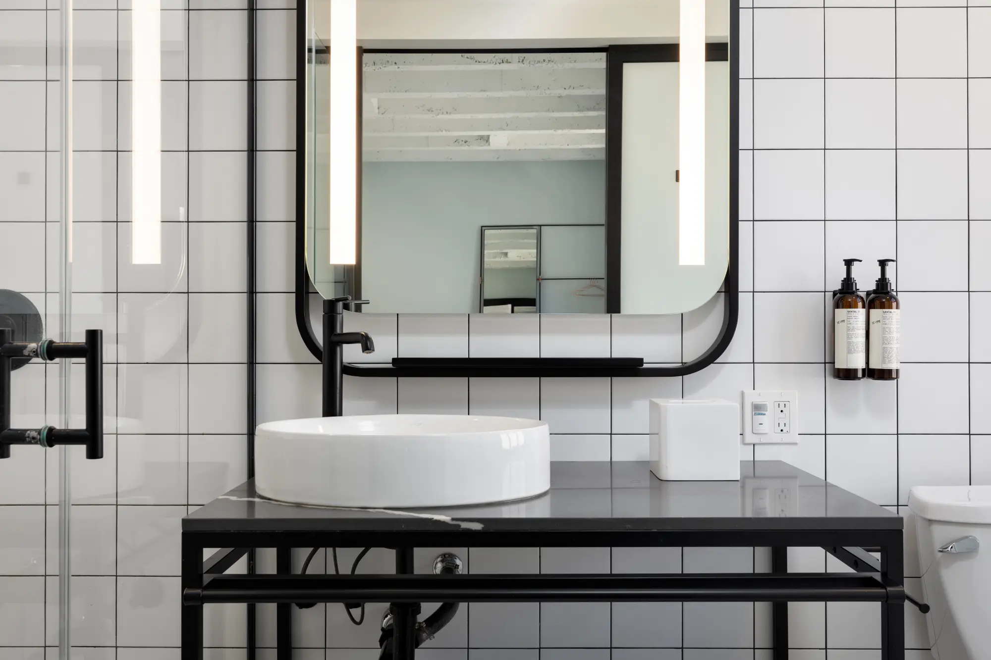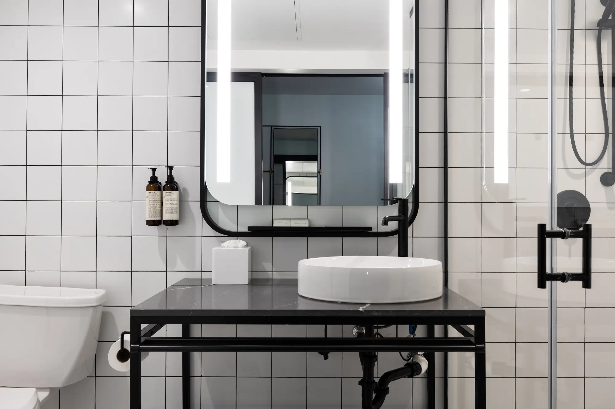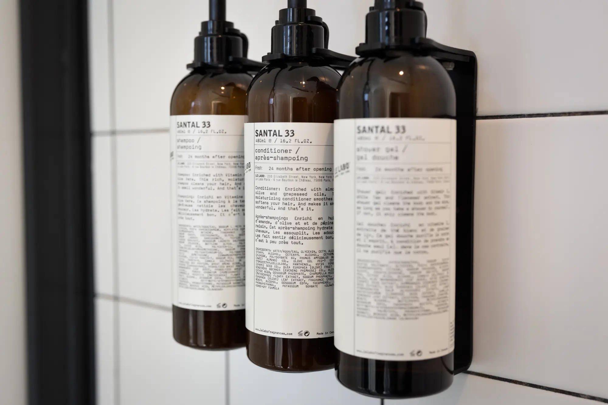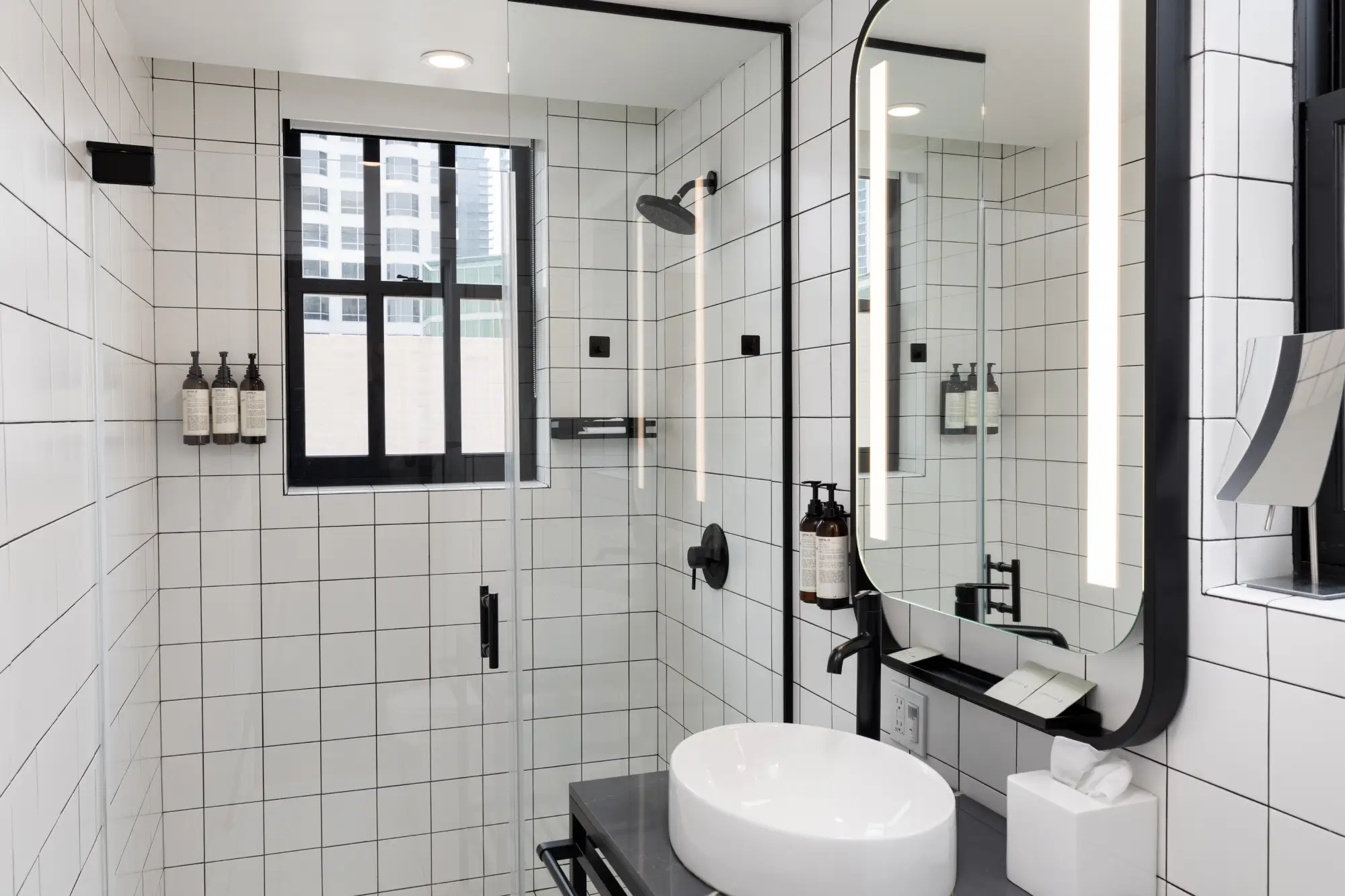 Modern studio with sitting area, sleeper sofa and curated local art. Enjoy Le Labo bath amenities, plush bathrobes & slippers, and walk-in showers or tubs with handheld feature.