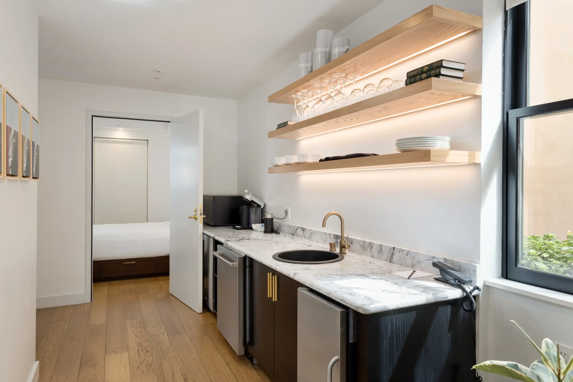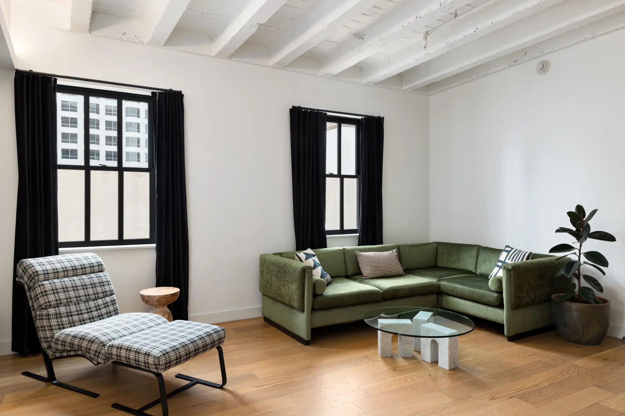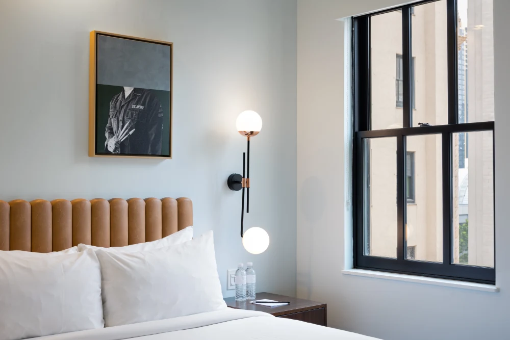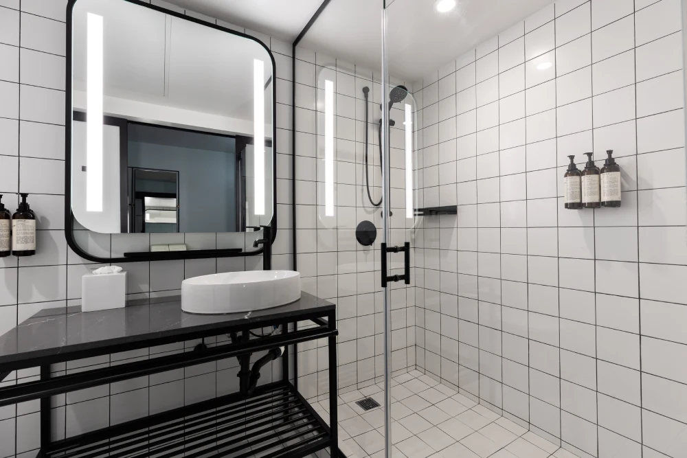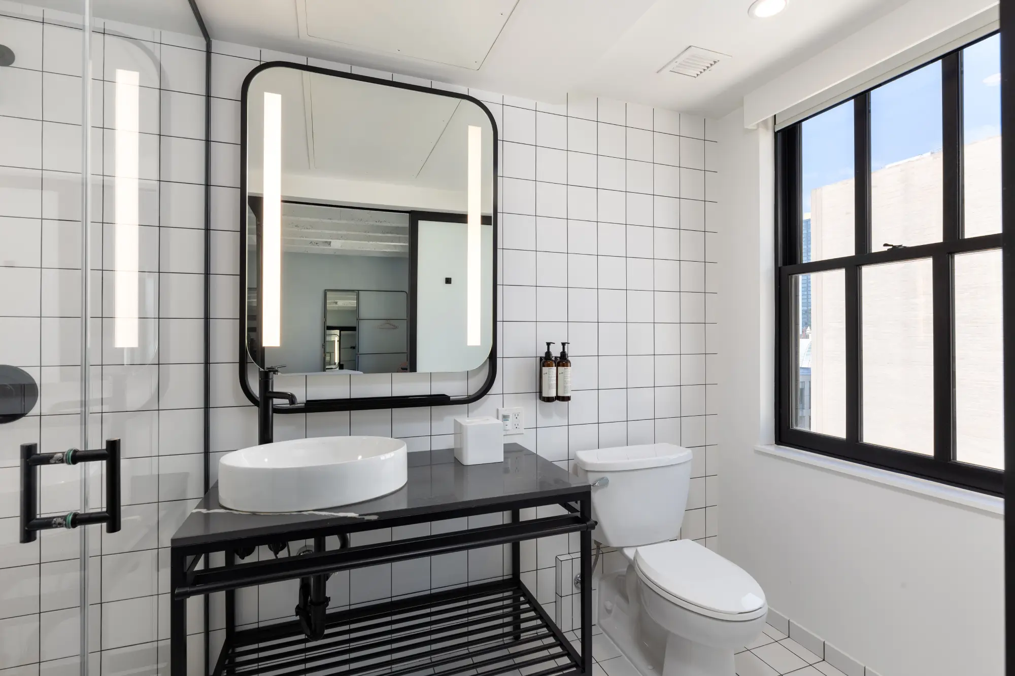 Modern studio with sitting area, sleeper sofa and curated local art. Enjoy Le Labo bath amenities, plush bathrobes & slippers, and walk-in showers or tubs with handheld feature.